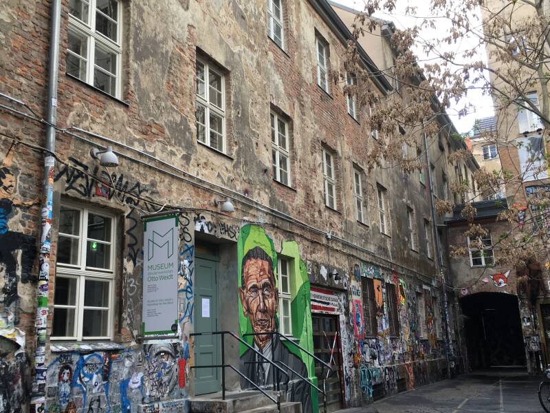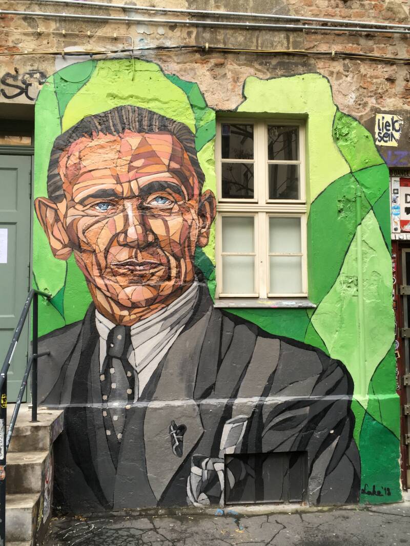 Een 'street art portret'' van Otto Weidt bij de ingang van zijn blindenwerkplaats.