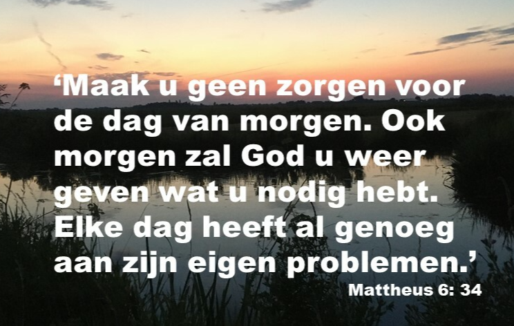 En Jezus zegt ook: ‘Leef bij de dag. Elke dag heeft al genoeg aan zijn eigen problemen.’ Mattheus 6: 34