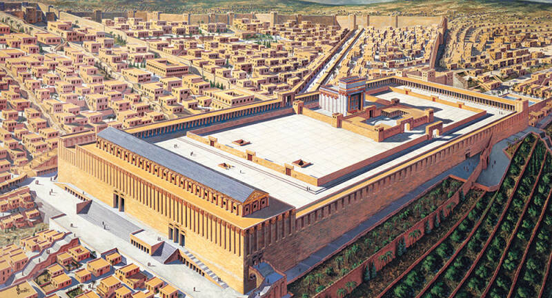 Het tempelcomplex van Herodes: een groot platform met steunmuren en daarop de tempel.