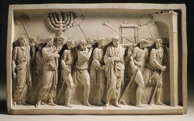 De Franse beeldhouwer Jean-Guillaume Moitte maakte deze kopie van de afbeelding op de Titusboog. Soldaten dragen de buit uit Judea, waaronder de menorah, de tafel der toonbroden en de bazuinen. (Museum Associates/Los Angeles County Museum of Art).