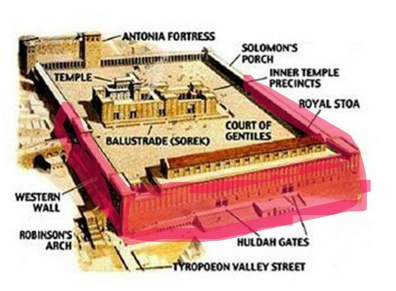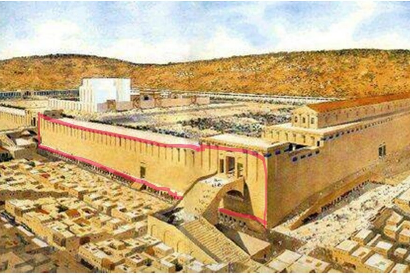 Tekening van de tijd van de Tempel van Herodes. Het rode blok is het deel van de westelijke muur (klaagmuur) dat op de foto hierna te zien is.